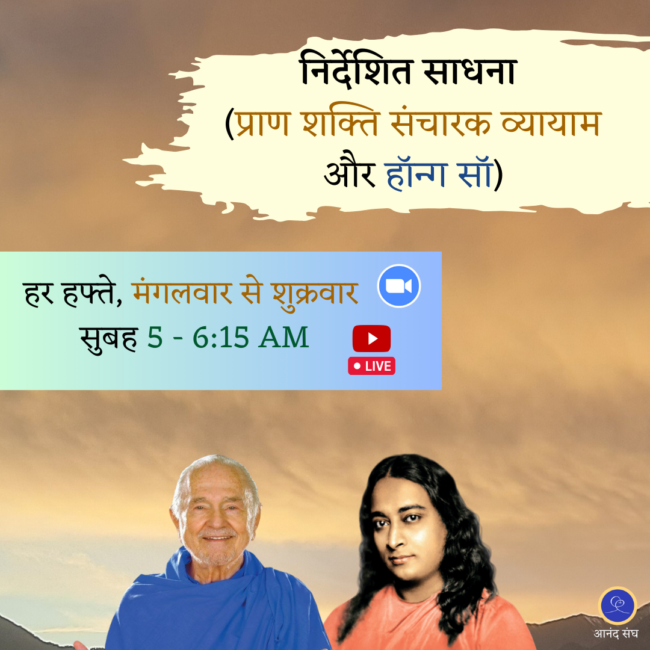 प्रेरणादायक वीडियो क्रिया योग क्या है? आधुनिक युग के लिए योगानंद जी की शिक्षाएँ लाहिड़ी महाशय के जीवन से हम क्या सीख सकते हैं? ध्यान के लिए क्या हमें संसार त्यागना होगा? मैं डिप्रेशन से बाहार कैसे आ सकता हूँ? और देखें नयास्वामी ज्योतिष जी और देवी जी के प्रेरक ब्लॉग पुनर्जन्म का पाठ नया साल, नई शुरुआत तूफान की आंख हम क्या बन सकते हैं खुशी समय से परे फ्यूचर सेंट्स क्लब ये परमहंस योगानंद के शिष्य हैं! आनंद कहाँ है आनंदमय समर्पण माँ गिलहरी और समुद्र अनुग्रह के शाश्वत स्वरूप Kali Ma एक योगी की आत्मकथा से जीवन के सबक परमेश्वर का सबसे बड़ा गुण दिव्य माँ का प्यार आध्यात्मिक शिक्षण को कैसे समझें और देखें... Weekly Offerings ध्यान साधना सत्रहर मंगलवार, शाम 7.30 – 8.15 PM हीलिंग प्रेयर सेशनहर गुरूवार, शाम 7.30 – 7.50 PM साप्ताहिक सत्संगहर शुक्रवार, 8 AM – 8:30 AM हर शनिवार क्रिया साधना – सुबह 6.30 – 9 AMक्रिया सत्संग – शाम 7.30 – 9 PMजुड़ने के लिए कृपया हमें संपर्क कीजिये हर हफ्ते, मंगलवार से शुक्रवार, सुबह 05:00 से 6:15 AM ध्यान और हीलिंग से सम्बंधित ध्यान करना सीखें मन को केंद्रित और शांत करने के लिए निर्देशित ध्यान साधना प्राण शक्ति संचारक व्यायाम (Energization Exercises) शांति और सद्भावना के लिए प्रार्थना | Peace & Harmony Prayer परमहंस योगानंद जी की हीलिंग प्रार्थना तकनीक और देखें भजन और कीर्तन ब्रह्मानंदम | Hymn To Brahma परमहंस योगानंद जय गुरु जय | Paramhansa Yogananda Jai Guru Jai माँ दर्शन दें | Reveal Thyself प्रभु मैं तुम्हारा | Lord I Am Thine आनंद आनंद नित्य नवीन आनंद और देखें एक योगी की आत्मकथा से अध्याय पढ़ें,“क्रिया योग का विज्ञान”